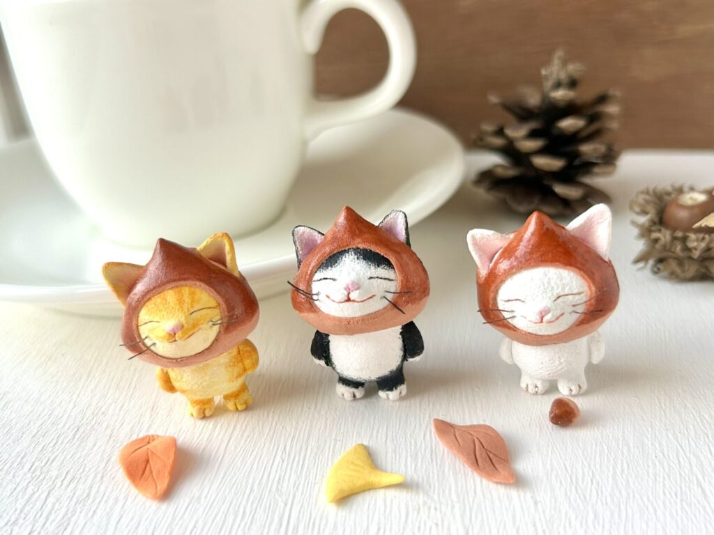 身長約3センチの小さな猫さん。毛色も個性も様々ですが、それぞれカボチャや栗をかぶってにこにこ笑顔。小さなカボチャや紅葉も秋の気分満載。
